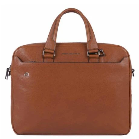 Luxe lederen laptoptas uit de Black Square serie van Piquadro. De collectie Black Square is gemaakt van full-grain Toscaans kalfsleer dat bewerkt is met plantaardige verf. De ongelijke look is het resultaat van een origineel proces, dat de warmte en de eigenschap van echt, onbewerkt leer behoudt. Na het looien plaatsen de deskundige handen de huiden in grote vaten gevuld met water zonder chemische stoffen toe te voegen. Het leer wordt dan gedroogd in trommels en vervolgens uitgelegd zodat vezels ontspannen. Dankzij dit proces, is elk stuk van de Black Square-collectie uniek.